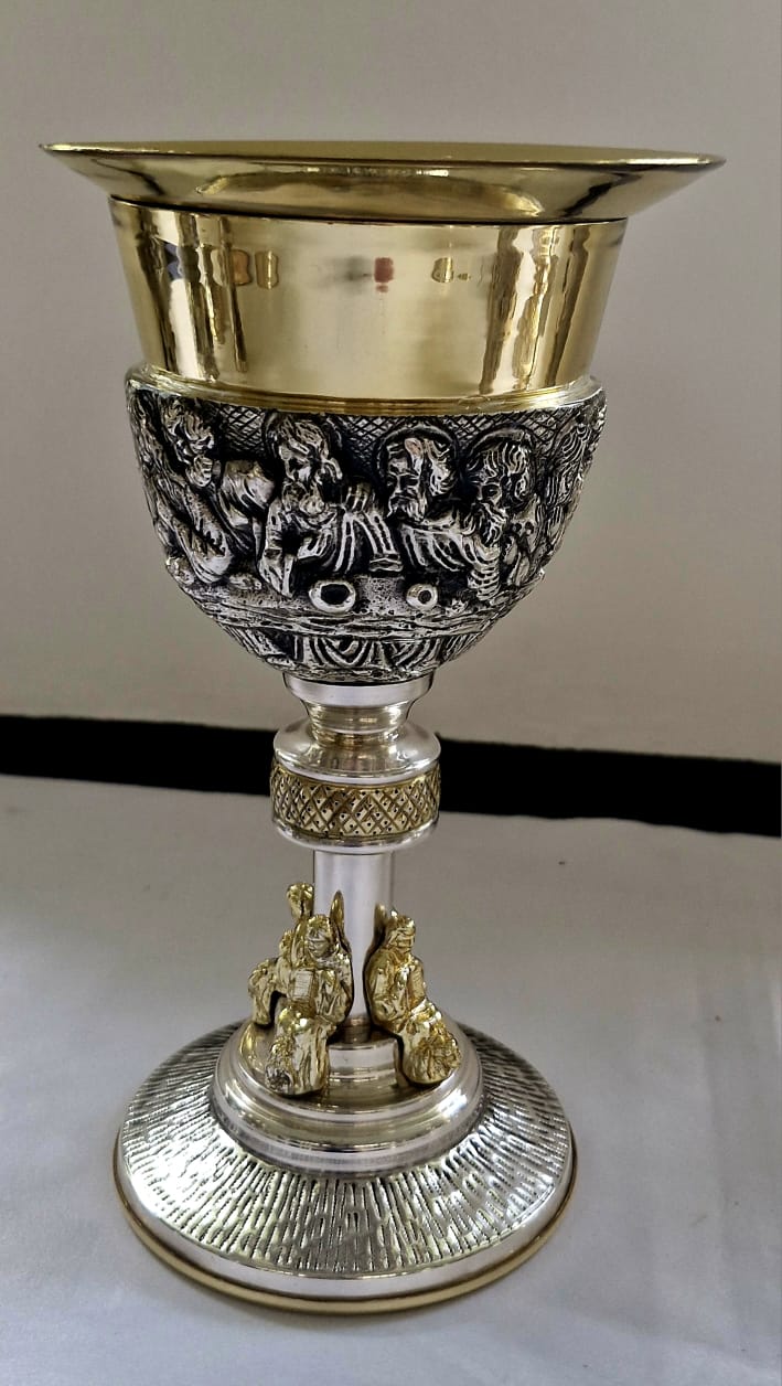 Cáliz apóstoles evangelistas de 24cm alto con baño de oro y plata y aplicación de acriltex para su conservación