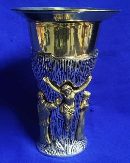 Cáliz calvario de 18cm alto en metal de bronce- latón base fundida con baño de oro y plata y aplicación de acriltex para su conservación