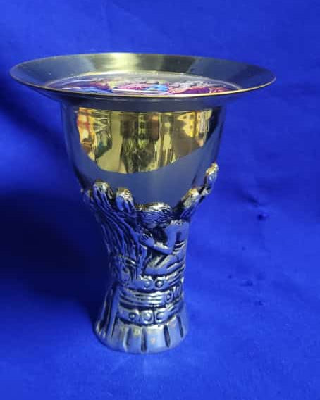 Cáliz sacrificio de Abraham de 16cm de alto en metal de bronce base fundida con baño de oro y plata y aplicación de acriltex para su conservación