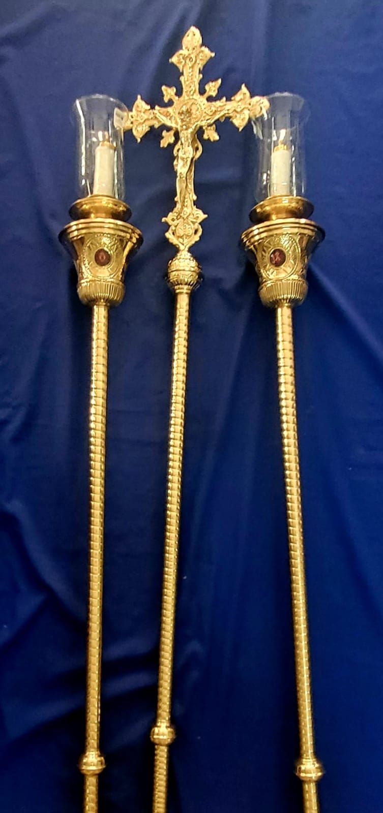 Ciriales y Cruz alta procesional en broce - latón, repujado ajustado y cincelado en relieve a mano de 1.80cm alto