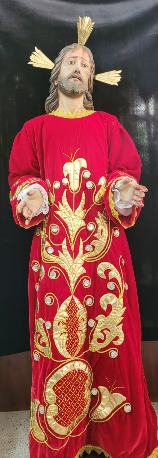 Nazareno de tamaño natural de1.70cm, en madera de cedro y fibra de vidrio(rostro, manos y pies) vestido bordado a mano y potencias en metal de bronce sencillas