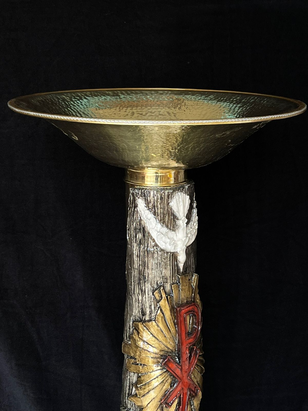 Pila bautismal portátil en metal de Latón - Bronce repujada y martillada a baño con base motivo espiritusanto en resina con aplicación de actiltex para su conservación