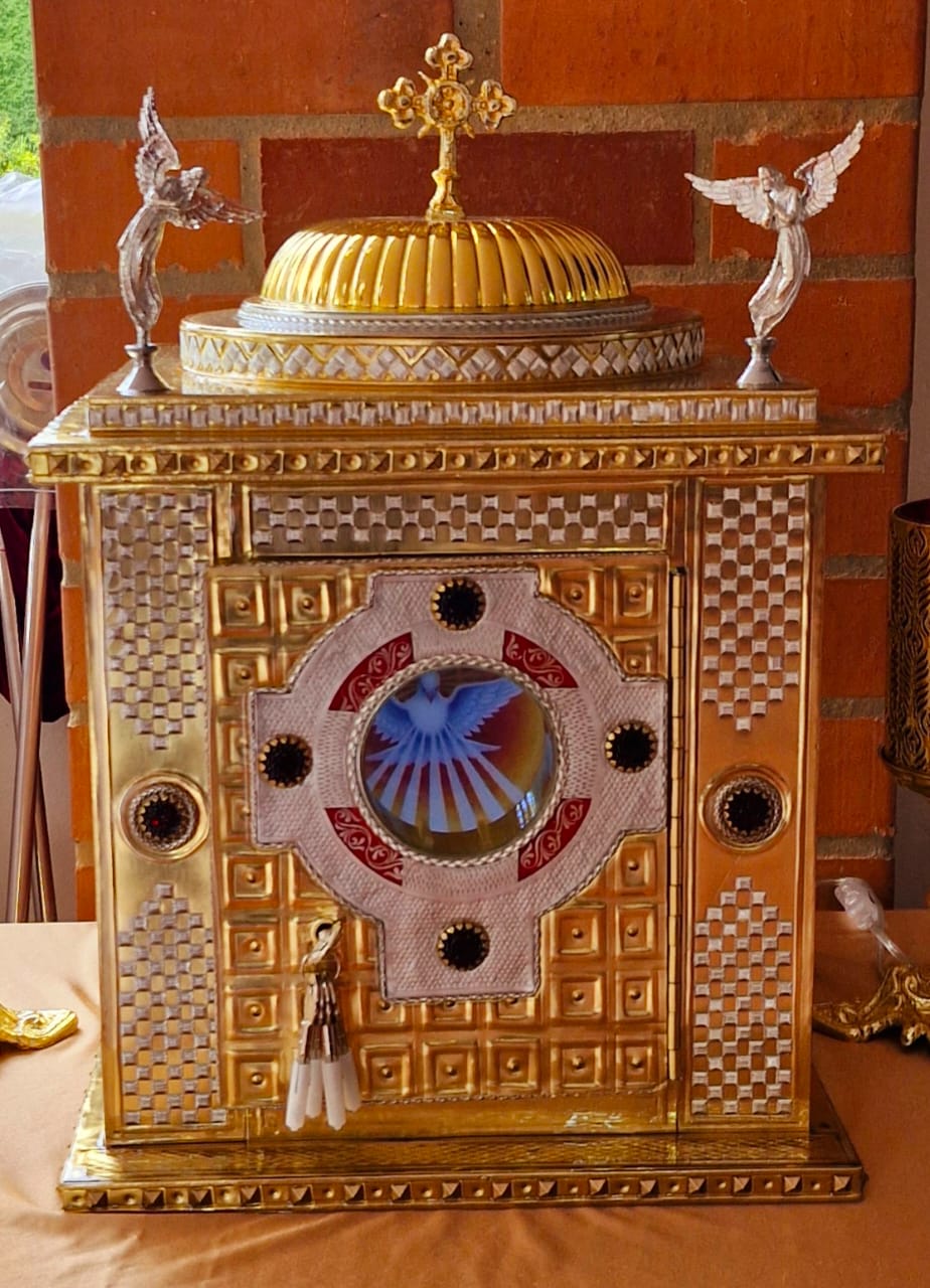 Sagrario ángeles danzarines con expositor y diptus intercambiables en metal de bronce : medidas de 50cm alto x 49cm frente x 35cm profundidad